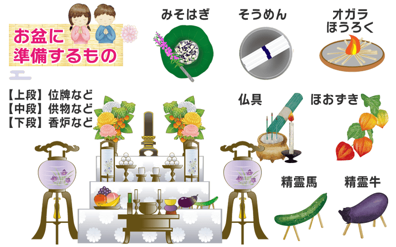 Dưa chuột tượng trưng cho ngựa (精霊馬) và cà tím tượng trưng cho con bò (精霊牛). Người ta quan niệm cố nhân cưỡi ngựa phi nhanh để thăm gia đình ở trần gian và cưỡi bò để từ từ rời đi lúc tiễn biệt.
