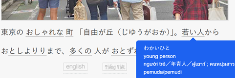 Điểm đặc biệt của WatanoC chính là từ điển tiếng Anh, Việt, Trung được tích hợp sẵn trong tất cả bài viết. Người học có thể di chuột đến từ vựng cần tra cứu để xem định nghĩa ngay lập tức mà không làm gián đoạn việc luyện đọc tiếng Nhật. Ngoài ra, người học cũng có thể xem bản dịch cả câu, được thực hiện bởi biên dịch viên thật, không phải A.I.