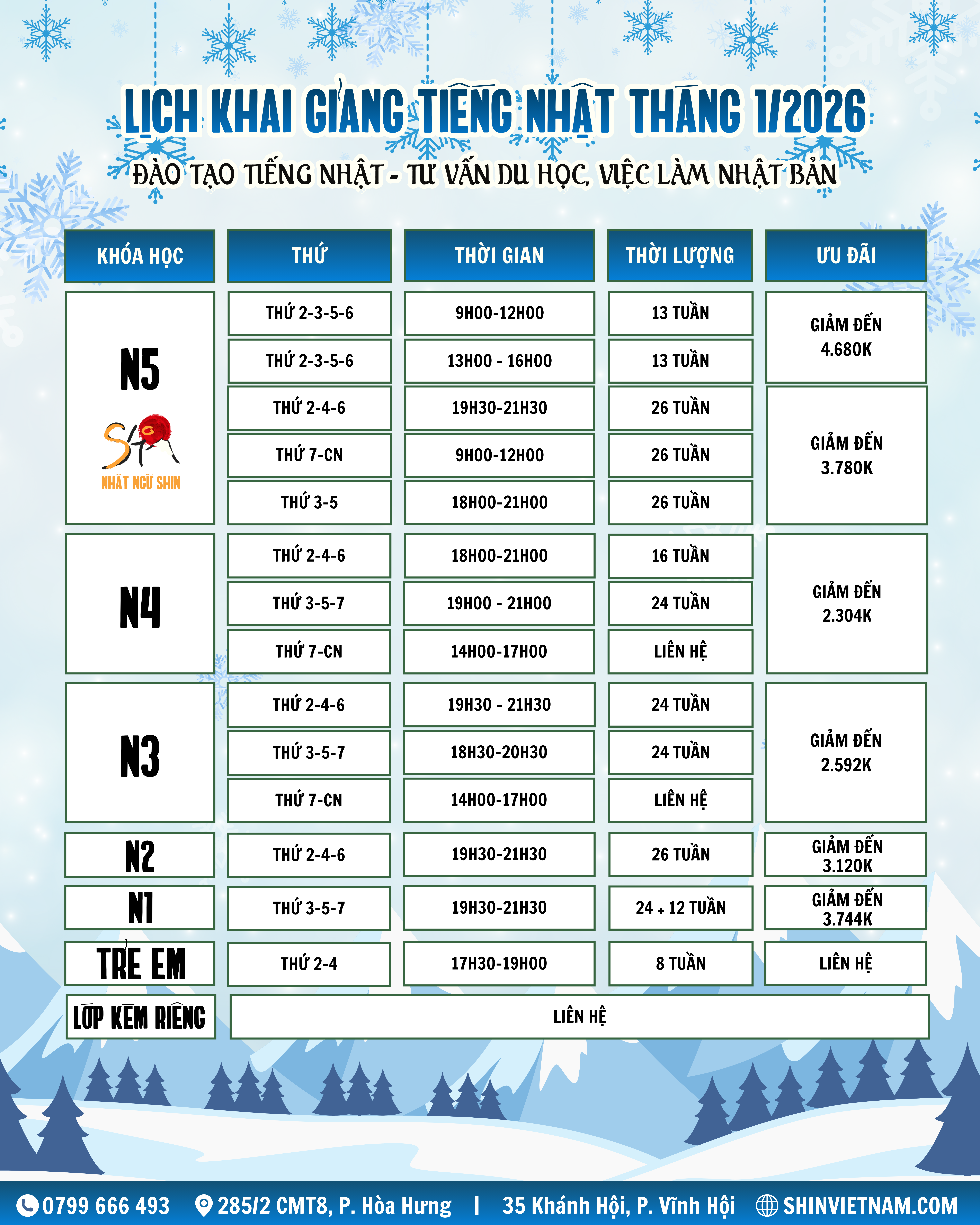 NHẬT NGỮ SHIN: LỊCH KHAI GIẢNG THÁNG 1/2026