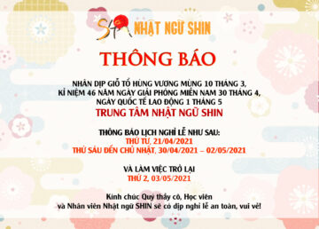 TRUNG TÂM NHẬT NGỮ SHIN THÔNG BÁO LỊCH NGHỈ LỄ THÁNG 4, 5 🚩Trung tâm Nhật ngữ SHIN thân gửi đến Quý thầy cô, Học viên và Nhân viên Trung tâm Nhật ngữ SHIN lịch nghỉ lễ: Giỗ tổ Hùng Vương mùng 10 tháng 3, ngày Chiến thắng 30 tháng 4 và Ngày Quốc tế