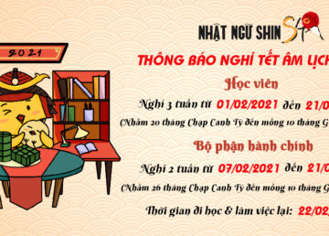Trung tâm Nhật ngữ SHIN xin thông báo lịch nghỉ Tết 2021 như sau: 🎋 Đối với học viên: Nghỉ từ 01/02 đến 21/02/2020 (03 tuần) 🎋 Đối với bộ phận hành chính: Nghỉ từ 07/2/2021 đến 21/02/2020 (02 tuần) 🇯🇵Thời gian học và làm việc trở lại: 22/02/2020 🇯🇵Trong thời gian nghỉ