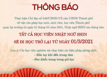 Thực hiện chỉ đạo của UBND TP.HCM tại CV số 505/ UBND-VX về việc tiếp tục kéo dài việc ngừng đến trường của học sinh, sinh viên sau Tết Nguyên Đán 2021, trung tâm Nhật ngữ SHIN xin thông báo đến toàn thể học viên các nội dung sau: Toàn thể học viên dự kiến