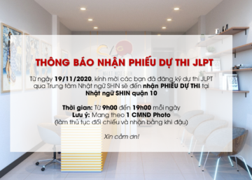 THÔNG BÁO NHẬN PHIẾU DỰ THI JLPT Các sĩ tử của SHIN ơi, Từ ngày 19/11/2020, vào 9h00 đến 19h00 mỗi ngày, các bạn nhớ ghé bộ phận chăm sóc học viên của SHIN để nhận phiếu báo dự thi nha Lưu ý: Các bạn nhớ mang theo CMND photo nộp cho SHIN (để đối