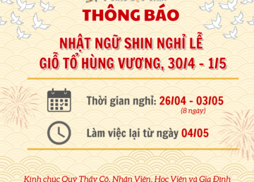 TRUNG TÂM NHẬT NGỮ SHIN THÔNG BÁO NGHỈ LỄ Giỗ tổ Hùng Vương mùng 10 tháng 3 Ngày giải phóng miền Nam 30 tháng 4 Ngày Quốc tế Lao động 1 tháng 5 – Nghỉ từ ngày: 26/04 – 03/05/2026 – Làm việc trở lại từ Thứ Năm, 04/05/2026 Kính chúc toàn thể Quý thầy
